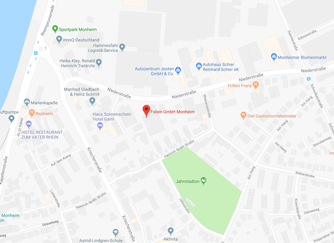 Die Folien GmbH Monheim liegt zentral zwischen Düsseldorf und Köln. Sie erreichen uns von der A 59, Ausfahrt 24 Richrath, indem Sie der Berghausener Straße in Richtung Baumberg (Monheim) folgen.